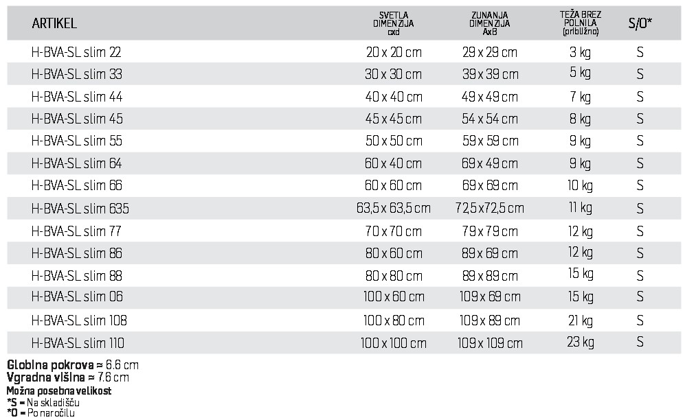 Lastnosti: Pokrov ima protismradno tesnilo proti vonju in vodi. Samo 5 cm vgradne globine. Še posebej primeren za situacije, kjer je omejitev glede vgradne višine. Plitki pokrov je tudi lažji, ko je napolnjen – z manj truda je lažja manipulacija. Višine polnila 14 mm je na voljo za polaganje plošč, ploščic, parketa itd. Vsebuje dva kemično odporna posebna tesnila. Pokrov je ojačan z vpeto armaturo iz jeklene mreže.