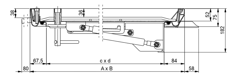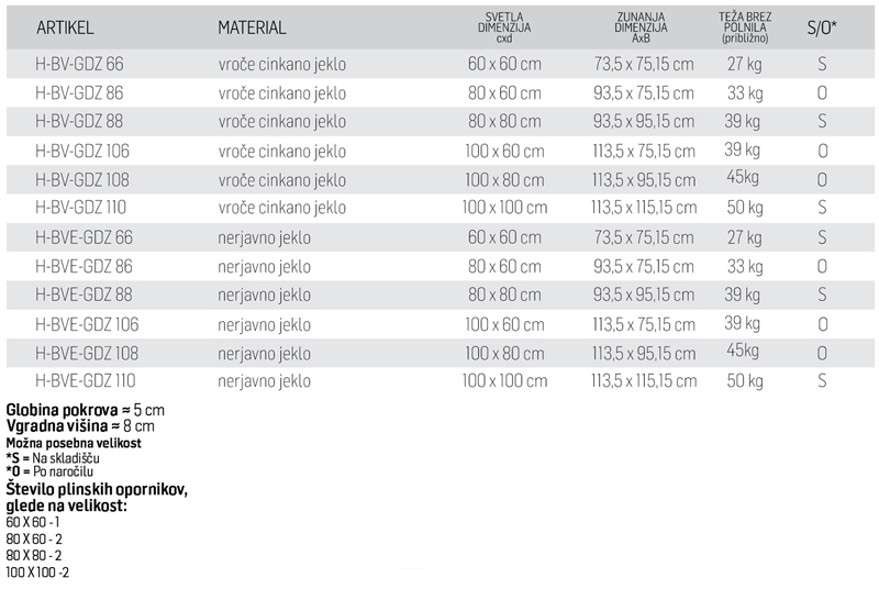 Material: BV(E) okvir, pokrov in prečni nosilec deb. 2 mm iz vroče cinkane pločevine in jeklenih prolov ali iz nerjavnega jekla razreda 304 (na zahtevo tudi iz nerjavnega jekla razreda 316 ). Vključuje tudi EPDM tesnilo.