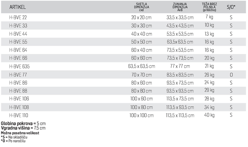 Namestitev: Vgradnja in montaža mora biti izvedena v skladu z navodili proizvajalca. V primeru vodotesnih pokrovov je treba paziti na tesnjenje zunanjega okvirja.