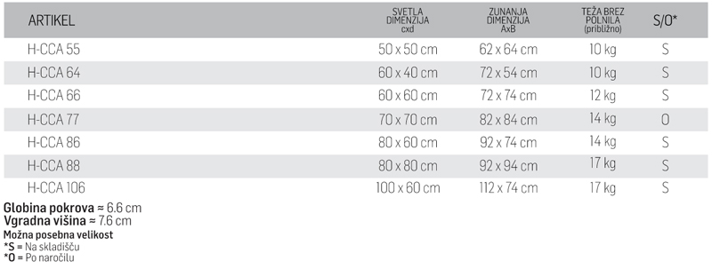 Lastnosti: sodobna lahka konstrukcija pokrova za dostop. Velik prihranek teže v primerjavi z pokrovi za dostop, polnjeni z betonom. Pokrov je dvignjen s tečajem, kar znatno zmanjša napor. Vgrajena je varnostna naprava, ki zaklene pokrov v dvignjenem položaju. Ker ovitek ni napolnjen s betonom, je montaža hitrejša in preprostejša. Višina 24 mm za polaganje plošč, ploščic, parketa itd. Pri tankih ploščicah razlika v višini lahko nadomestimo z uporabo ustreznega lepila za ploščice Zaprta oblika z kakovostno končno obdelavo finalnega tlaka. Arhitekturni izgled, predvsem vidnih robov. Neopazni vogalni spoji olajšajo povezovanje ploščic, plošč itd.