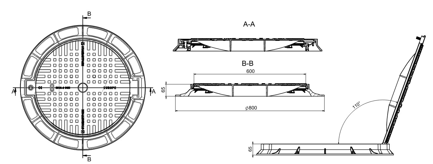 - V zasnovi pokrova, sta predvidena dva vzorca lukenj: za priročno in enostavno odpiranje pokrova ter za preverjanje situacije v jašku