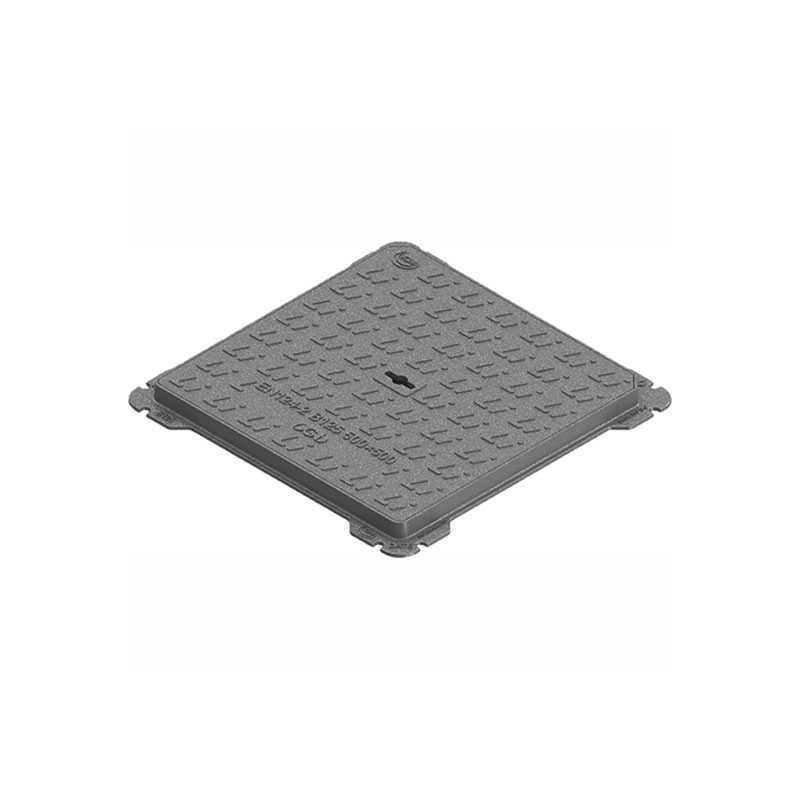 - Opis: Kvadratni pokrov jaška z okvirjem iz nodularne litine GJS 500-7 Standard UNI EN124-1/2, skupina 2, razred B125 (kN 125 = t. 12,75) Pokrov z dvema kotoma 45° za vodeno montažo. Premaz v skladu z direktivami uredbe REACH CE 1907/2006, testiran za preverjanje morebitne prisotnosti SVHC. Okvir z neprekinjenim notranjim nosilnim kanalom pokrova, brez prekinitev za hidravlično tesnjenje