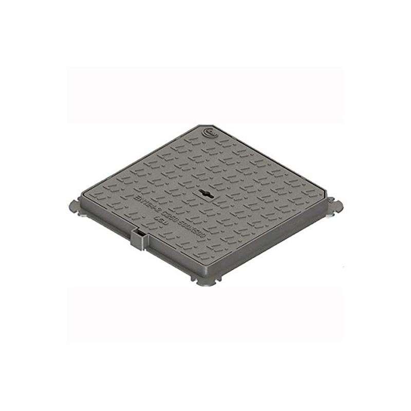 KVADRATNI POKROVI Z OKVIRJEM “SMARTLOCK”. “SMART” TIP - Opis: Kvadratni pokrov jaška z okvirjem iz nodularne litine GJS 500-7 Standardi UNI EN124-1/2, skupina 3, razred C250 (kN 250 = t. 25,49) Pokrov z dvema kotoma 45° za vodeno montažo. Premaz v skladu z direktivami uredbe REACH CE 1907/2006, testiran za preverjanje morebitne prisotnosti SVHC. Okvir z neprekinjenim notranjim nosilnim kanalom pokrova, brez prekinitev za hidravlično tesnjenje