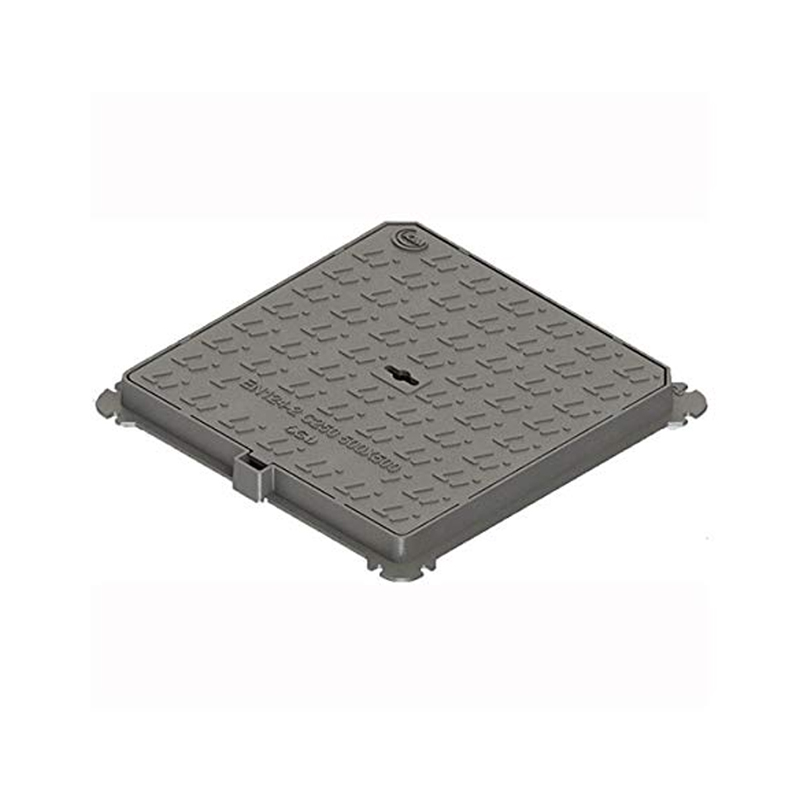 KVADRATNI POKROVI Z OKVIRJEM “SMARTLOCK”. “SMART” TIP - Opis: Kvadratni pokrov jaška z okvirjem iz nodularne litine GJS 500-7 Standardi UNI EN124-1/2, skupina 3, razred C250 (kN 250 = t. 25,49) Pokrov z dvema kotoma 45° za vodeno montažo. Premaz v skladu z direktivami uredbe REACH CE 1907/2006, testiran za preverjanje morebitne prisotnosti SVHC. Okvir z neprekinjenim notranjim nosilnim kanalom pokrova, brez prekinitev za hidravlično tesnjenje