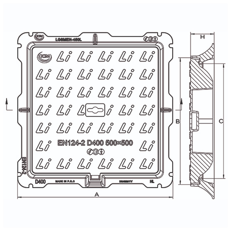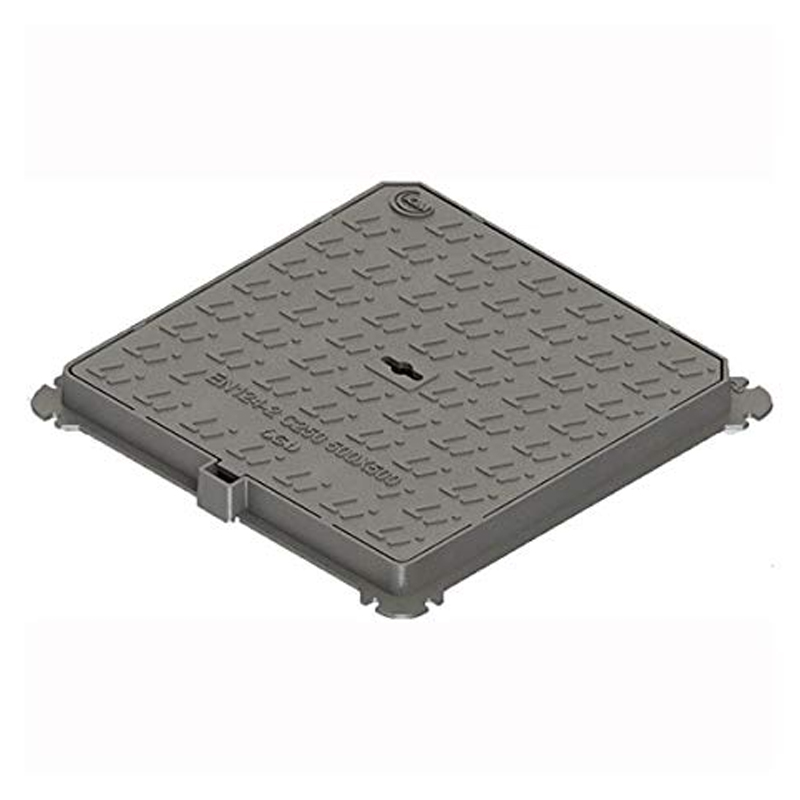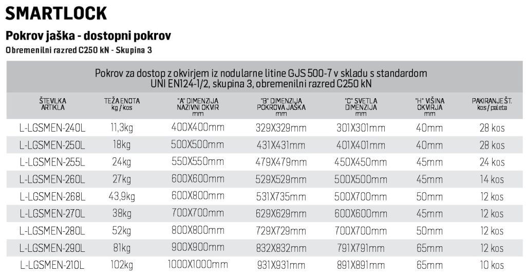 KVADRATNI POKROVI Z OKVIRJEM “SMARTLOCK”. “SMART” TIP - Opis: Kvadratni pokrov jaška z okvirjem iz nodularne litine GJS 500-7 Standardi UNI EN124-1/2, skupina 3, razred C250 (kN 250 = t. 25,49) Pokrov z dvema kotoma 45° za vodeno montažo. Premaz v skladu z direktivami uredbe REACH CE 1907/2006, testiran za preverjanje morebitne prisotnosti SVHC. Okvir z neprekinjenim notranjim nosilnim kanalom pokrova, brez prekinitev za hidravlično tesnjenje