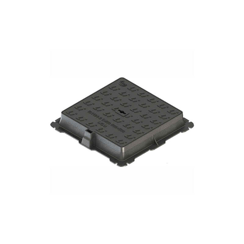 KVADRATNI POKROVI Z OKVIRJEM “SMARTLOCK”. “SMART” TIP - Opis: Kvadratni pokrov jaška z okvirjem iz nodularne litine GJS 500-7 Standardi UNI EN124-1/2, skupina 4, razred D400 (kN 400 = t. 40,79) Pokrov z dvema kotoma 45° za vodeno montažo. Premaz v skladu z direktivami uredbe REACH CE 1907/2006, testiran za preverjanje morebitne prisotnosti SVHC. Okvir z neprekinjenim notranjim nosilnim kanalom pokrova, brez prekinitev za hidravlično tesnjenje