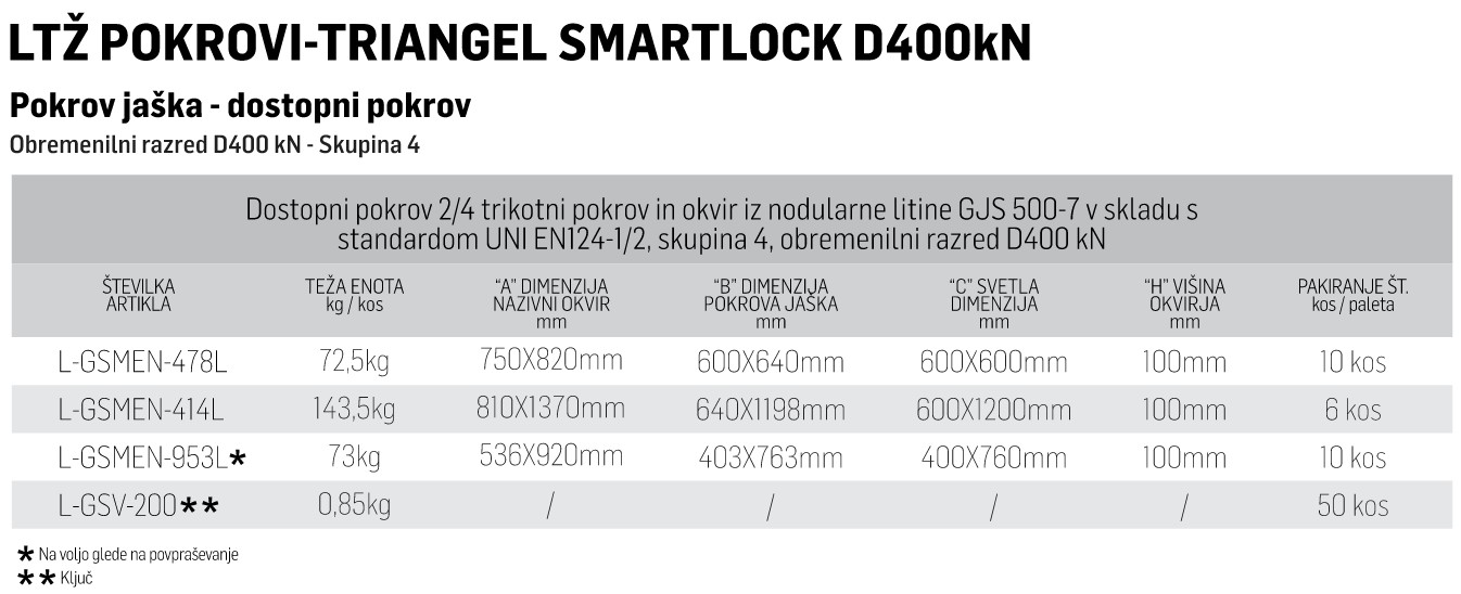 REVIZIJSKI SISTEM Z OKVIRJEM IN POKROVOM OBLIKA – TRIANGEL / POKROV ZA DOSTOP IN OKVIR S TEČAJI; Z 2/4 VEZANIM TRIKOTNIM OKVIRJEM ZNOTRAJ OKVIRJA, OPREMLJENA Z ZAPAHOM IZ NERJAVEČEGA JEKLA POKROV ZA DOSTOP Z OKVIRJEM IN 2/4 TRIKOTNIM POKROVOM, PRILOŽENA S/S ZAKLEPNA NAPRAVA - Opis: Pokrov jaška z okvirjem iz nodularne litine GJS 500-7, standard UNI EN124-1/2, skupina 4, razred D400 (kN 400 = t. 40,79). Zgibni trikotni pokrovi s 3 točkami obešanja in varnostnim zaklepom. Premaz v skladu z direktivami uredbe REACH CE 1907/2006, testiran za preverjanje morebitne prisotnosti SVHC (snovi, ki vzbujajo veliko zaskrbljenost) – snovi vključene v seznam v okviru Evropske REACH zakonodaje.