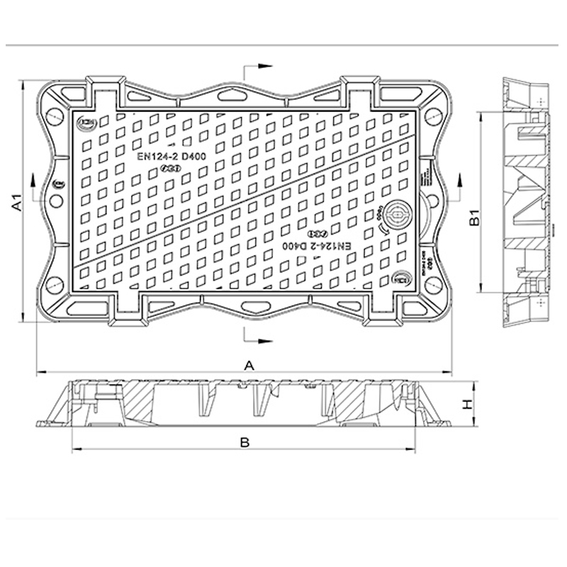 - Opis: Pokrov za dostop in okvir iz nodularnega litega železa GJS 500-7 in v skladu s standardom UNI UNI EN124-1/2, skupina 4, razred D400 (kN 400= t. 40,79). Zgibni trikotni na 3-točkovnih obešalnih pokrovih. Premaz v skladu z direktivami uredbe REACH CE 1907/2006, testiran za preverjanje prisotnosti SVHC (snovi, ki vzbujajo veliko zaskrbljenost) – snovi vključene v seznam v okviru Evropske REACH zakonodaje.