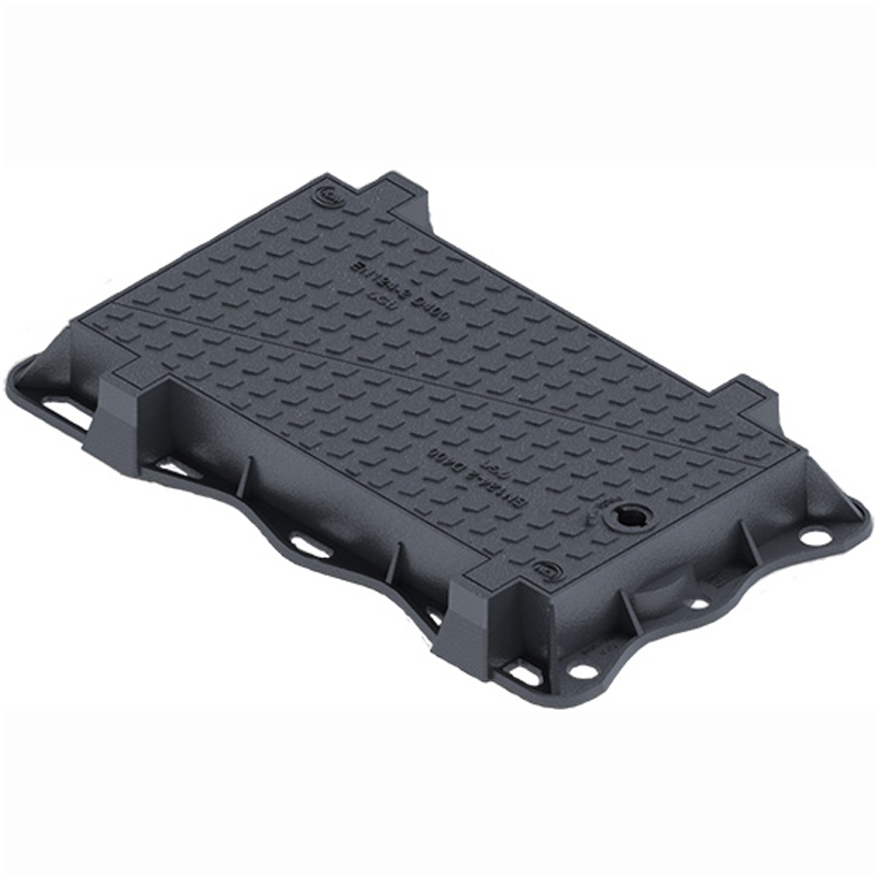 - Opis: Pokrov za dostop in okvir iz nodularnega litega železa GJS 500-7 in v skladu s standardom UNI UNI EN124-1/2, skupina 4, razred D400 (kN 400= t. 40,79). Zgibni trikotni na 3-točkovnih obešalnih pokrovih. Premaz v skladu z direktivami uredbe REACH CE 1907/2006, testiran za preverjanje prisotnosti SVHC (snovi, ki vzbujajo veliko zaskrbljenost) – snovi vključene v seznam v okviru Evropske REACH zakonodaje.