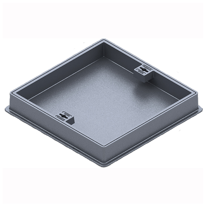 - Opis: Vgradni kvadratni pokrov jaška in okvir iz nodularnega litega železa GJS 500-7 v skladu s standardom UNI EN124-1/2, skupina 3, razred C250 (kN 250 = t.25,49)