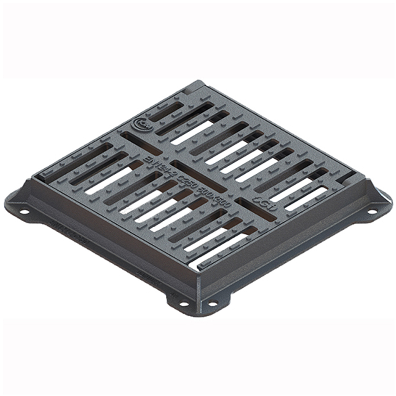 - Opis: Ravna rešetka in okvir nodularnega litega železa GJS 500- 7 in v skladu s standardom UNI EN124-1/2, skupina 3, razred C250 (kN 250 = t. 25,49). Zagotovljena je prednastavitev za sifon. Premaz v skladu z direktivami uredbe REACH CE 1907/2006, testiran za preverjanje prisotnosti SVHC (snovi, ki vzbujajo veliko zaskrbljenost) – snovi vključene v seznam v okviru Evropske REACH zakonodaje. Zgibni vrh požiralnika z varnostnim sistemom zaklepanja.
