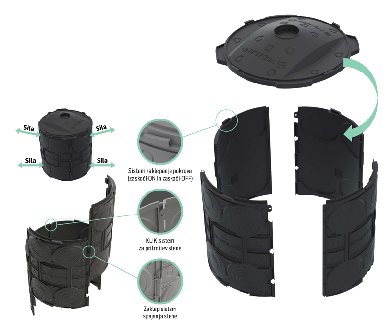 - Zanesljiv sistem pokrova in stenskega zaklepanja zagotavlja dobro stabilnost in vzdržljivost pri enakomerni obremenitvi z vseh strani