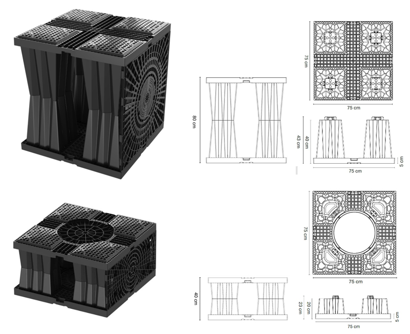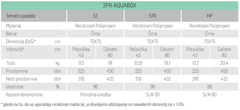 2PR-AQUABOX je modularni in pregledljiv element v plastičnem materialu (PP), ki se uporablja za izvedbo podzemnih bazenov za infiltracijo, zadrževanje in zbiranje deževnice.